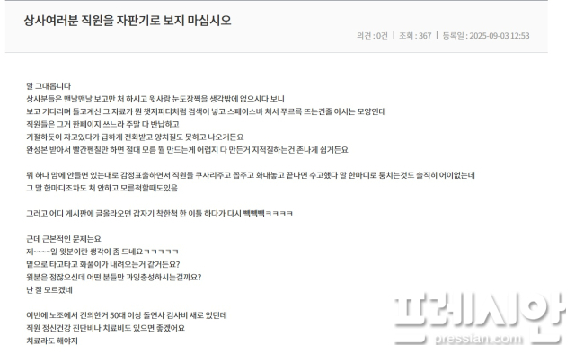 그는 "근본적인 문제는 가장 윗분이란 생각이 든다"면서 "밑으로 타고 타고 화풀이가 내려오는 것 같은데, 어떤 분들만 과잉충성하는 것인가"라며 "노조에서 50대 이상 돌연사 검사비 건의했던데 직원 정신건강 진단비나 치료비도 포함시켜 달라"고 토로했다.