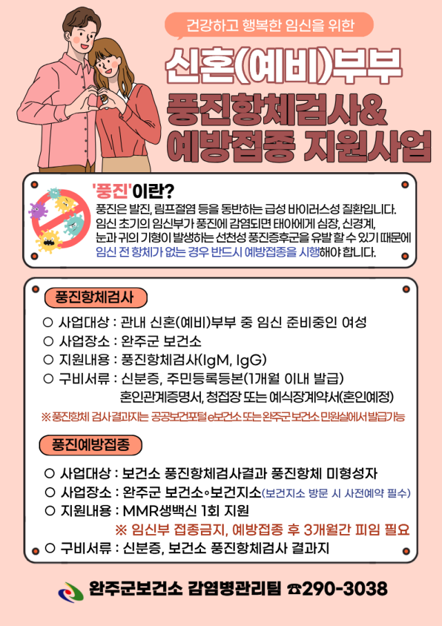 전북 완주군이 신혼 및 예비부부 여성을 대상으로 풍진 항체검사와 예방접종을 무료 지원한다. 건강한 임신과 안전한 출산을 돕기 위한 취지다.