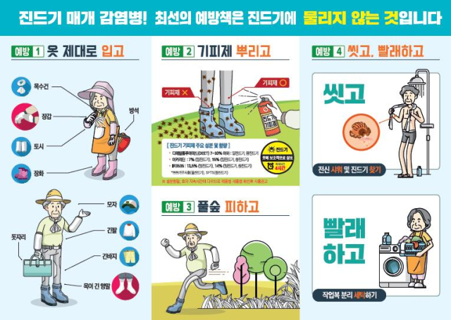 시는 진드기 물림을 피하기 위한 핵심 예방수칙으로 풀밭에 앉거나 눕지 않기, 긴 옷과 장화 착용, 기피제 사용, 외출 후 즉시 샤워하고 옷을 갈아입기 등을 제시했다.