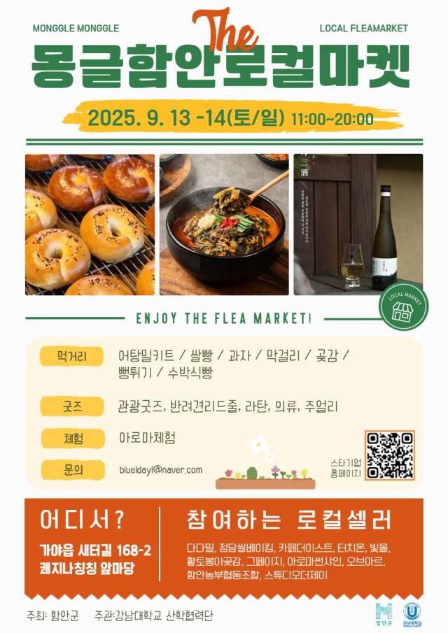 경남 함안군은 오는 13일과 14일 오전 11시부터 오후 8시까지 가야읍 쾌지나칭칭 야외마당에서 '몽글함안 로컬마켓'을 연다고 밝혔다.