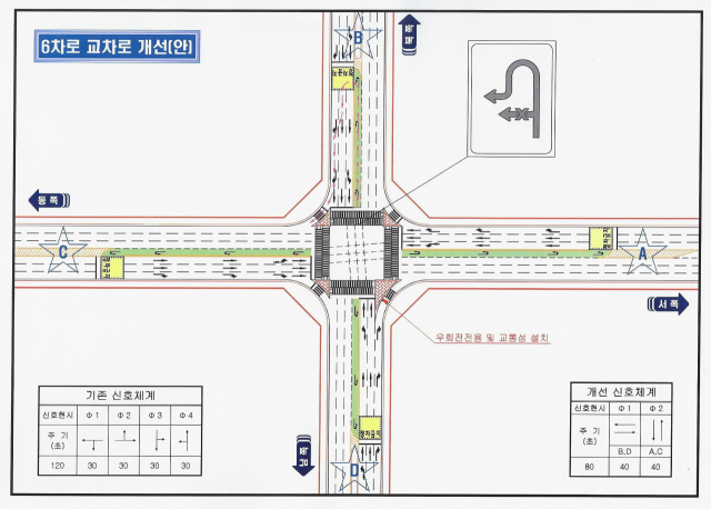 신호체계는 동서로 직진, 남북으로 직진신호로 2현시로 운영된다.(개선안 참조)