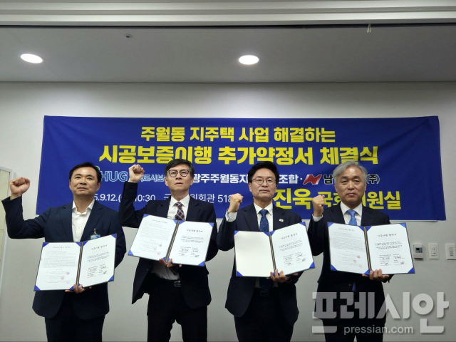 협약 체결에는 HUG 윤명규 사장 직무대행, 주월동 조합 주용욱 조합장, 남양건설 정인수 부사장이 참석했다.