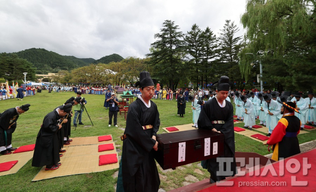 ‘실록의 봉안 및 포쇄 의식’은 당시 국가 차원에서 행해졌던 중요 의식으로, 이날 행사에서는 적상산사고에서 △조선왕조실록을 햇볕과 바람으로 말려 보존하던 전통 방식과 △포쇄를 마친 실록을 궤 안에 넣는 의식, △실록 궤의 내용물을 기록하고 사각을 자물쇠로 잠그는 봉고식이 재연됐다.