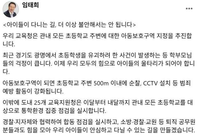 한편, 임태희 교육감은 이날 자신의 SNS를 통해 "아이들이 다니는 길, 더 이상 불안해서는 안된다"라며 "우리 모두의 힘으로 아이들의 울타리를 만들어 아이들이 안심하고 다닐 수 있는 길을 만들겠다"고 밝혔다.