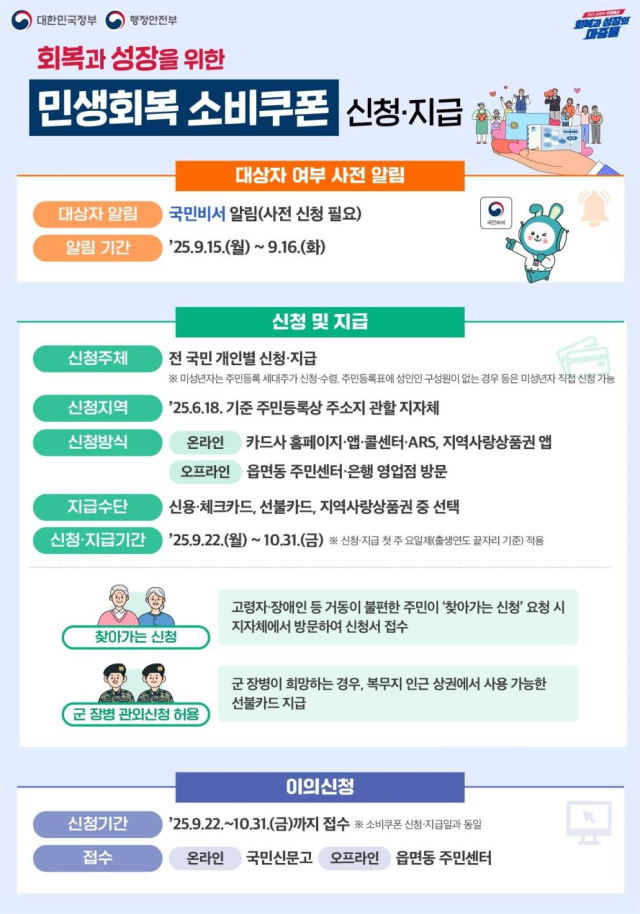 한편, 정부·카드사·지역화폐사는 민생회복 소비쿠폰과 관련해 URL이나 링크가 포함된 문자메시지를 발송하지 않는다며, 출처가 불분명한 문자의 인터넷 주소는 클릭하지 말고 즉시 삭제할 것을 당부했다.