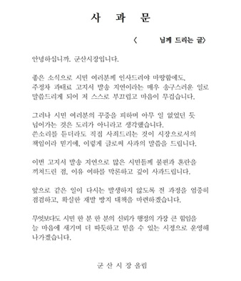 강임준 시장은 “좋은 소식으로 시민 여러분께 인사드려야 마땅함에도 주정차 과태료 고지서 발송 지연이라는 문제로 말씀드리게 되어 매우 부끄럽고 마음이 무겁다”며 “시민 여러분의 꾸중을 외면한 채 넘어가는 것은 도리가 아니라고 생각했기에 쓴소리를 듣더라도 시장으로서 마땅히 져야 할 책임이라 생각하고 이번 일에 대해 깊이 사과드린다”고 말했다.