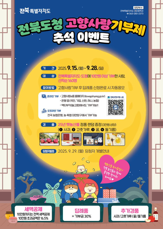 전북특별자치도가 추석을 앞두고 ‘고향사랑기부제 추석 이벤트’를 진행한다. 기부를 통한 지역 발전 참여를 독려하고, 기부자에게는 명절 상차림에 도움이 되는 지역 특산품을 선물하는 방식이다.