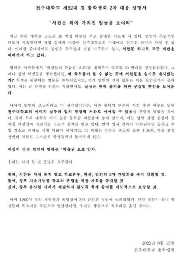 앞서 총학생회는 지난 15일 발표한 2차 대응 성명서에서 “서한문 뒤에 가려진 얼굴을 보이라”며 법인의 책임 있는 태도를 촉구했다. 성명서는 △학교본부·학생·법인의 3자 간담회 개최 △학교 존립을 위한 계획 공개 △학생 참여 제도 보장 등을 요구했으며, 1800여 명의 재학생·졸업생이 이에 동의했다고 밝혔다.