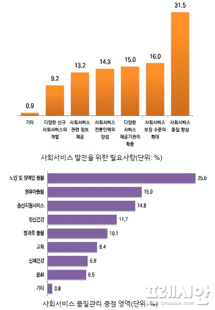 광주시민은 사회서비스 발전을 위한 필요사항으로 '사회서비스 품질 향상'(31.5%)을 최우선 과제로 꼽았다. 이어 '사회서비스 보장수준의 확대'(16.0%), '다양한 서비스 제공기관의 확충'(15.0%), '사회서비스 전문인력의 양성'(14.3%) 순으로 나타나, 사회서비스의 양적 확대도 중요하지만 질적 개선을 우선시하는 것으로 볼 수 있다.