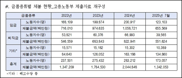 이 가운데 퇴직금 체불액은 △2022년 5466억원 △2023년 9746억원 △2024년 8229억원에 이어 2025년 1~7월에만 5516억원에 달해 2022년 연간 체불액을 이미 넘어섰다.