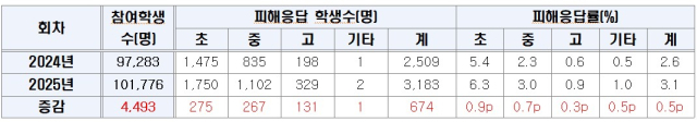 조사 결과에 따르면 전북 지역 10만 1776명이 참여한 이번 조사에서 3183명(3.1%)의 학생이 학교폭력 피해를 호소했다.