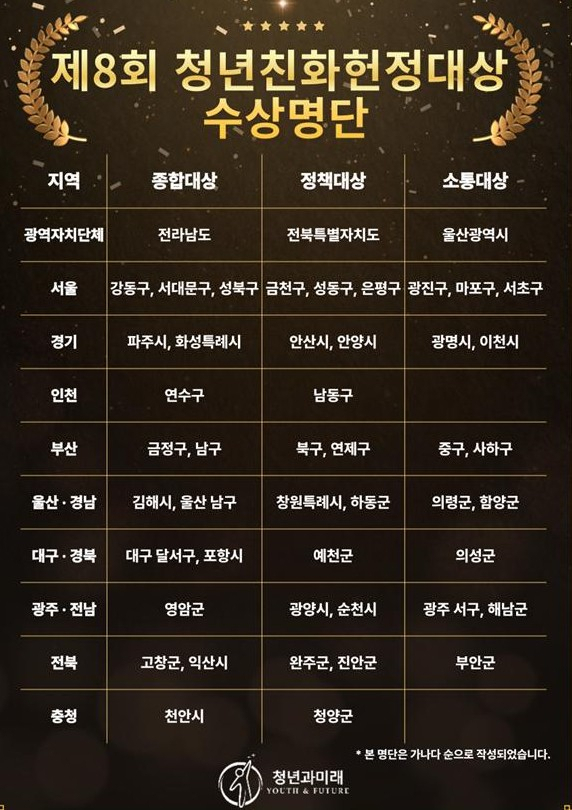 성과도 나타나고 있다. 전북도는 지난 8월 국회사무처 산하 사단법인 ‘청년과 미래’가 주관한 제8회 청년친화헌정대상에서 광역자치단체 정책부문 우수자치단체로 선정됐다. 도-시군-청년이 함께하는 거버넌스 체계와 정주 여건 개선 노력이 긍정적 평가를 받았다.