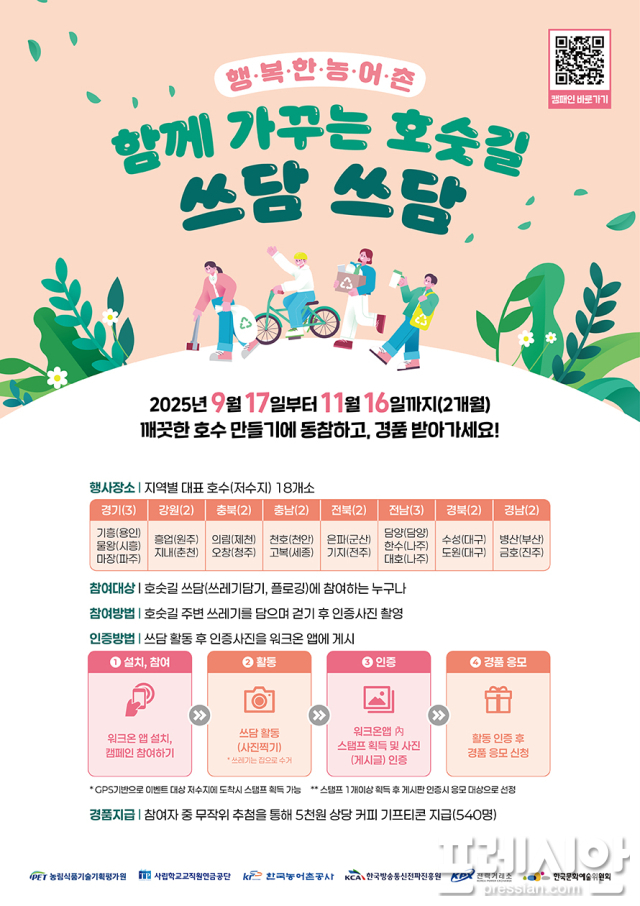 한편, 공사는 오는 11월 16일까지 전국 18개 대표 저수지를 무대로 워크온 앱을 활용한 국민 참여형 인증 이벤트를 진행한다. 쓰담 활동 후 인증사진을 앱에 업로드하면 누구나 참여할 수 있으며, 추첨을 통해 기념품도 받을 수 있다.