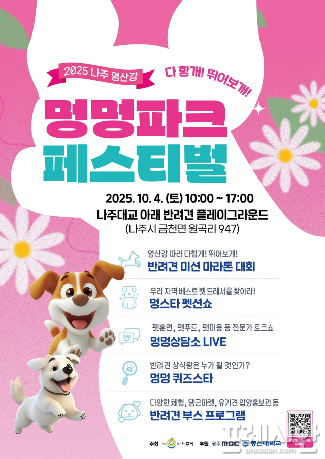 나주시(시장 윤병태)는 오는 10월 4일 영산강 반려견 플레이그라운드에서 '2025 영산강 멍멍파크 페스티벌'을 개최한다고 19일 밝혔다. 이번 행사는 유기견 입양 문화 확산과 반려동물과의 공존을 주제로 다양한 체험 프로그램을 마련했다.