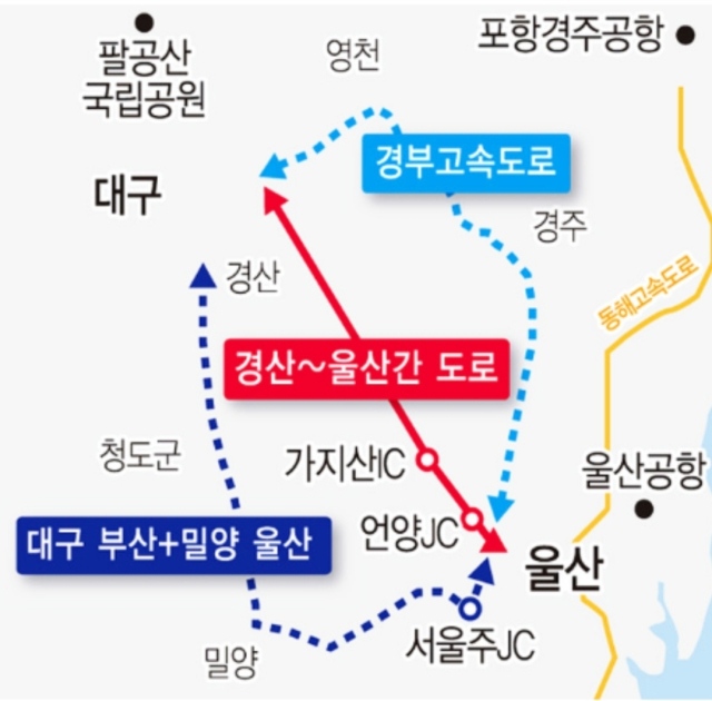 울산 경산 간 고속도로가 신설되면 현재 73km인 구간이 50km로 줄어들고 이동 시간도 52~55분에서 36분으로 단축된다. 울산시와 대구·경북은 경산 지역 2000여 부품업체가 연간 약 2000억원의 물류비를 절감할 것으로 전망하고 있다. 총사업비는 약 3조원 규모로 2035년 개통을 목표로 추진 중이다.