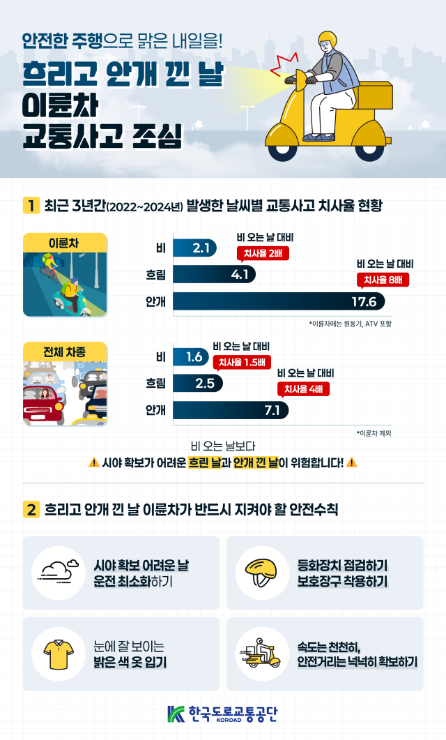 한국도로교통공단 교통사고분석시스템(TAAS)에 따르면 최근 3년간(2022~2024년) 안개 낀 날과 흐린 날 발생한 이륜차(원동기, 사륜오토바이 포함) 교통사고 치사율은 각각 17.6, 4.1로 나타났다. 이는 비 오는 날 대비 각각 8배, 2배에 달하는 수치다.