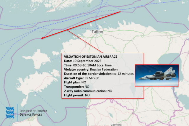 나토 유럽연합군 최고사령부(SHAPE)는 이날 대변인 명의 성명에서 "오늘(19일) 오전 러시아의 미그(MiG)-31 전투기 3대가 에스토니아 영공을 침범했다"고 밝혔다.