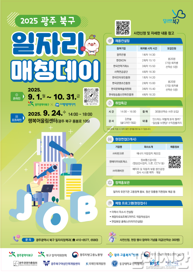 올해 행사는 광주고용노동청, 광주경영자총협회 등 취업 지원 기관 20여 곳이 참여한 가운데 취업 정책홍보 부스 운영, 취업특강, 채용 컨설팅, 현장 채용 면접 등 다채로운 구직자 맞춤형 프로그램이 제공될 예정이다.