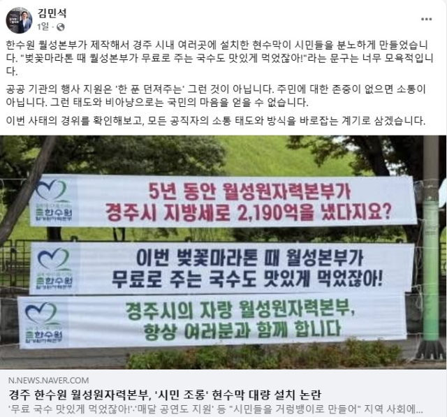 김민석 총리는 이같은 내용이 담긴 언론 기사를 자신의 페이스북에 공유하고 "한수원 월성본부가 제작해서 경주 시내 여러곳에 설치한 현수막이 시민들을 분노하게 만들었다. '벚꽃마라톤 때 월성본부가 무료로 주는 국수도 맛있게 먹었잖아!'라는 문구는 너무 모욕적이다"라고 비판했다.