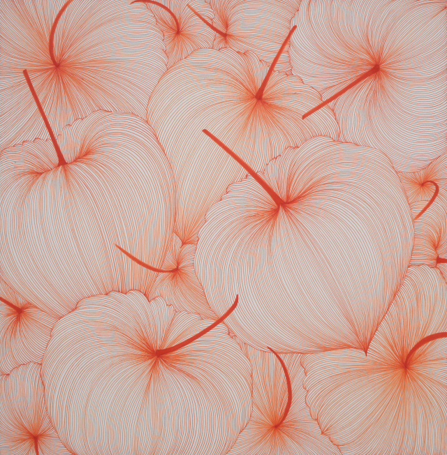 반면 이애리 작가는 주로 한지에 아주 심플한 주묵(朱墨)이나 청묵(靑墨) 선만을 사용해 시그니처 소재인 ‘꽈리’ 형상에 명상적 사유의 감흥을 전한다.