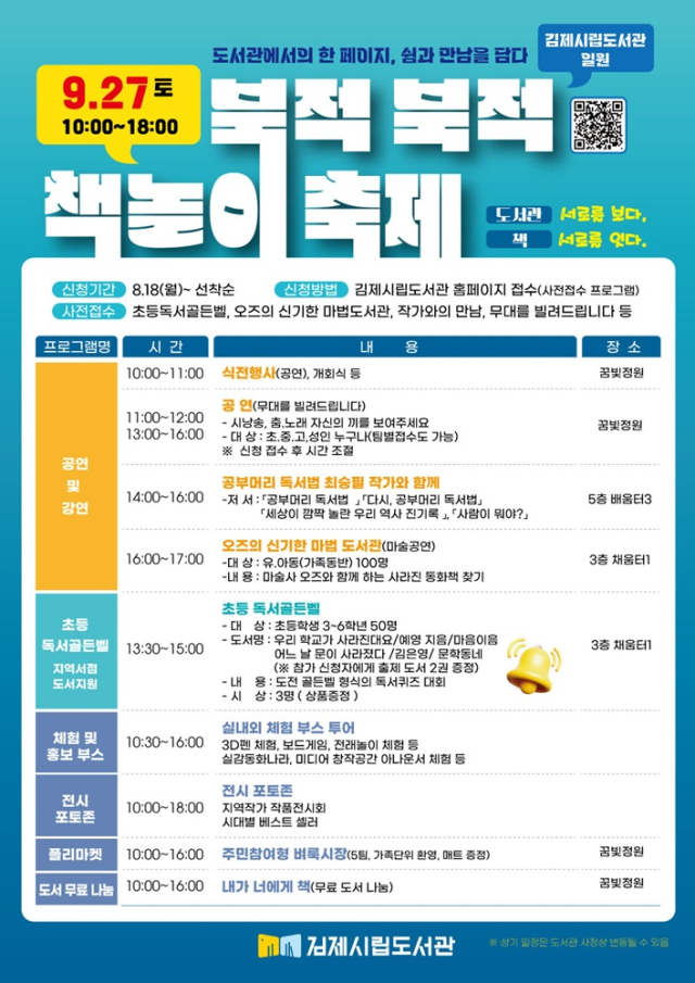 정성주 김제시장은 “이번 축제가 도서관을 통한 지역 주민의 문화 향유와 세대 통합의 장이 되기를 기대한다”며 “앞으로도 시민이 책과 함께하는 풍요로운 삶을 누릴 수 있도록 지원을 아끼지 않겠다”고 밝혔다.