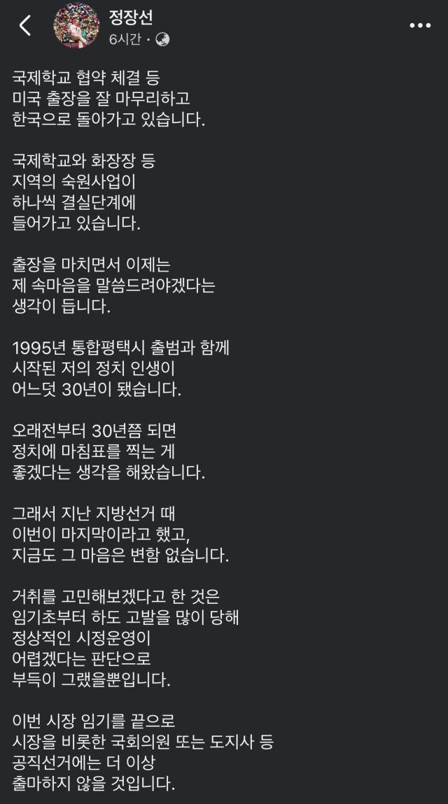 정장선 경기 평택시장이 25일 자신의 사회관계망서비스(SNS)페이지를 통해 정계 은퇴선언을 했다.