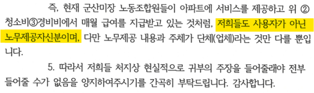전북 군산 미장휴먼시아아파트 관리업체 강남씨스템이 청소·경비 노동자들의 ‘사용자’ 지위를 스스로 부인하는 공문을 노조 측에 보낸 것으로 알려져 논란이 확산되고 있다.