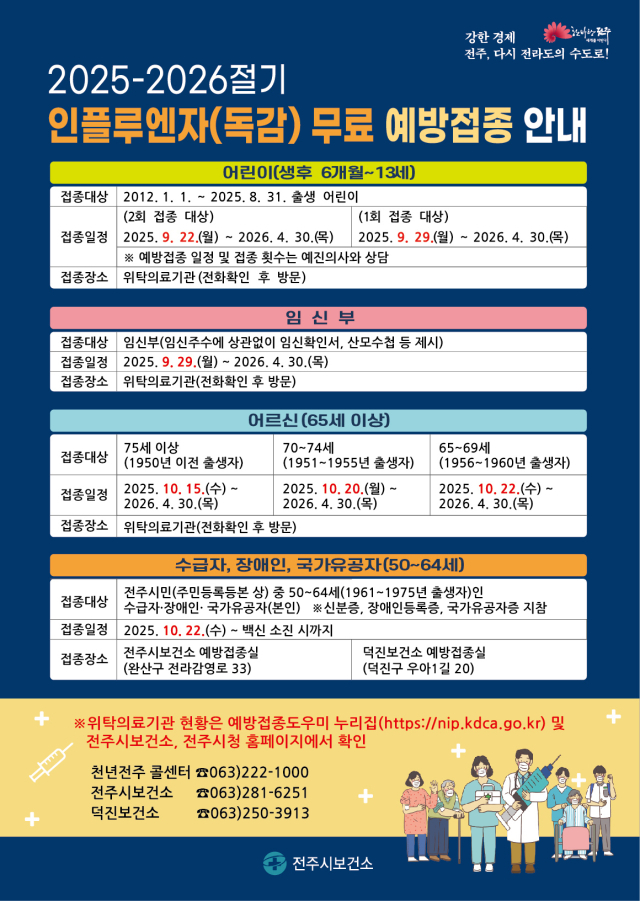 또한 75세 이상은 10월 15일부터, 70~74세는 20일부터, 65~69세는 22일부터 접종 가능하다. 같은 날부터 전주시에 주소를 둔 50~64세 취약계층(기초생활수급자·장애인·유공자)도 보건소에서 무료로 접종을 받을 수 있다.