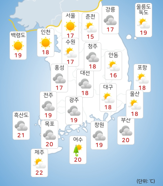 이날 낮 최고기온을 대전 24도, 세종·천안 25도, 청주 26도로 예보됐다.