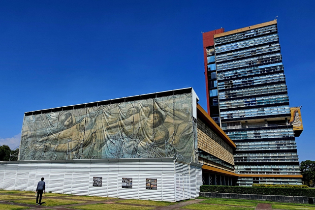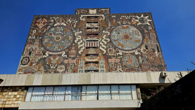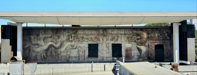 시케이로스는 선배들과 비교해 기술, 이념, 제작방식만이 아니라 또 다른 중요한 차이가 있다. 그 차이를 확인하기 위해 나는 멕시코시티 남쪽에 있는 '세계 최대의 대학'인 국립 멕시코대학(UNAM)을 찾아갔다. UNAM의 중앙도서관에 도착하자, 건물 위에 세워진 압도적인 벽화에 숨이 막혔다. 오른쪽은 서구가 보는 '코페르니쿠스식 우주'라면 왼쪽은 마야가 본 '고대 멕시코식 우주'를 그려 대비한 것이다. 갑자기 무미건조하고 자기정체성이 없는 서울대학교 건물이 부끄러워졌다.