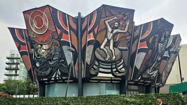 멕시코시티에서 반드시 봐야 하는 것이 폴리포름(Polyforum)이다. 1968년 멕시코올림픽에 맞춰 기획됐지만 1970년대에 완성된 이 건축물은 갤러리와 극장 등을 통합한 종합예술관으로 시케이로스가 어디까지 진화했는가를 잘 보여주는 대작이다. 그는 벽화를 건축물에 맞춰 그리는 입체적 벽화로 발전시켰고 '지구와 우주를 향한 인류의 행진'이라는 엄청난 크기(8700평방미터)의 벽화를 그렸다. 이 벽화는 1부 '부르주와 민주혁명을 향한 인류의 전진', 2부 '미래의 혁명', 3부 '평화, 문화, 조화'라는 3부작으로 되어 있다.