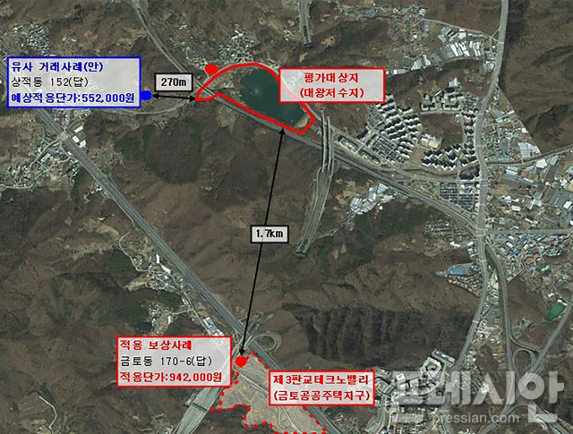 더욱이 이번 감정평가에서는 ‘유지’를 평가하면서 농지 가격을 그대로 기준가격으로 적용했지만, 유지와 농지의 가격 비율을 0.5로 산정한 타 지자체 사례(국민권익위원회 의결)를 준용할 경우 최대 756억 원까지 과대 평가됐을 것으로 추정되고 있다.
