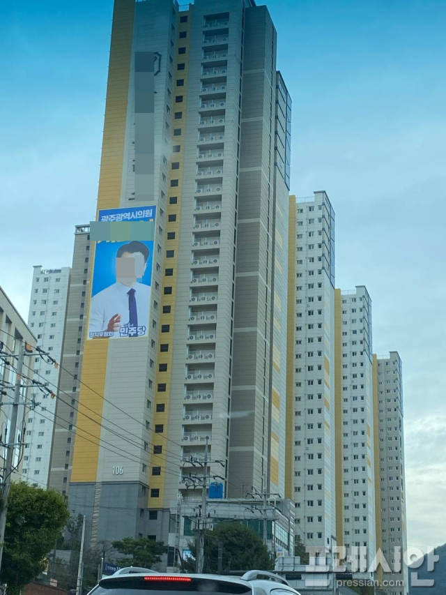 추석 연휴를 하루 앞둔 2일 광주 남구 주월동의 한 주상복합아파트 외벽에 S광주광역시의원의 대형 현수막이 걸려 주민들이 어리둥절했다.