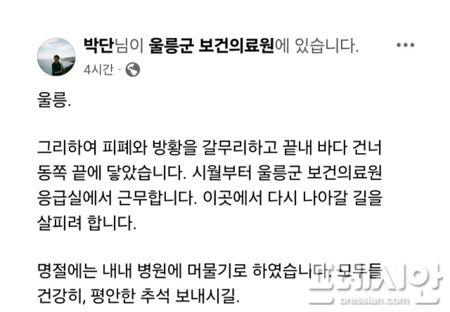 3일 <프레시안> 취재를 종합하면 박 전 위원장은 지난 1일 자신의 페이스북을 통해 "피폐와 방황을 갈무리하고 끝내 바다 건너 동쪽 끝에 닿았다"며 "10월부터 울릉군 보건의료원에서 근무한다"고 전했다. 그는 또 "이곳에서 다시 나아갈 길을 살피려 한다. 명절에는 내내 병원에 머물기로 했다"고 근황을 전했다.