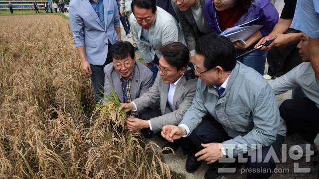 김민석 총리는 7일 오후 장흥군 안양면 해창리 일원의 벼 깨씨무늬병 피해 현장을 찾아 "벼 깨씨무늬병 피해가 농업재해로 인정받을 수 있도록 관계부처와 적극적으로 관심을 기울이겠다"고 밝혔다.