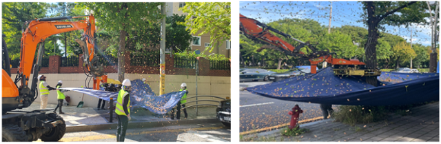 기동반은 가로수 담당 부서 직원 97명으로 구성되며, 진동수확기와 수거망을 활용해 열매를 신속히 수확하고, 낙과 발생 구간은 상시 청소를 진행한다.