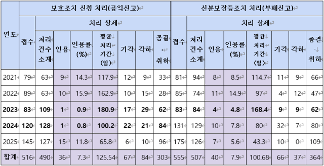 참여연대가 더불어민주당 김남근 의원실을 통해 권익위로부터 '2021년 1월~2025년 7월 공익제보자 보호제도 운영실태'를 제출받아 9일 발표한 결과를 보면, 해당 기간 권익위는 '공익신고자 보호조치' 신청 516건 중 36건이 인용됐다. 인용률은 7.3%다.