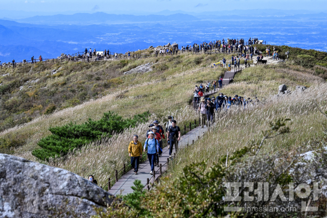 ▲무등산 정상 개방 행사에 참여한 시민들이 서석대에서 지왕봉 정상구간을 오르고 있다.2025.10.09ⓒ광주광역시