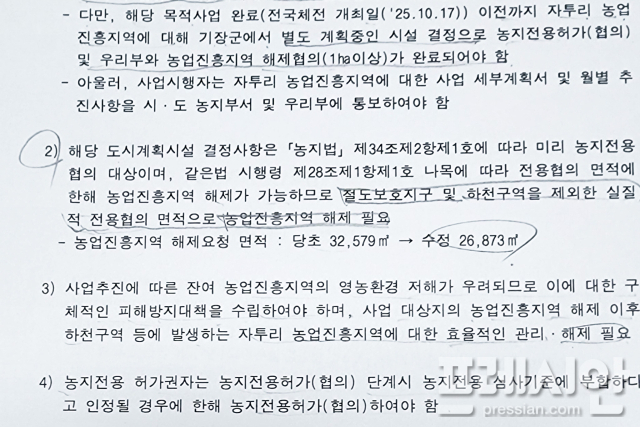 그러나 11일 <프레시안>의 취재에 따르면 지난해 12월 농림축산식품부는 일광 테니스경기장에 대한 기장군의 도시관리계획 변경과 관련해 '조건부 승인' 결정을 내린 것으로 파악됐다. 당시 기장군은 일광 테니스장과 인접한 농업진흥지역 3만2579㎡에 대해 농업진흥지역 해제를 신청했지만 농림부가 허가한 지역은 2만6873㎡에 그쳤다.