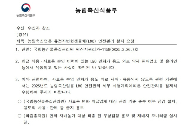 이같은 사실은 농식품부 공문에서도 확인된다. 농식품부는 지난 3월 26일 국립농산물품질관리원·국립종자원에 보낸 '농림축산업용 유전자변형생물체(LMO) 안전관리 철저 요청' 공문에서 "최근 식용사료용 승인이력이 있는 LMO면화가 용도외로 약재 판매업소 및 온라인 등에서 유통되고 있는 사실이 확인된 바 있다"고 밝혔다.