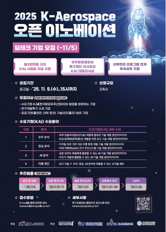 우주항공청이 주최하고 KAI·연구개발특구진흥재단·한국항공우주 연구원·진주강소특구(경상대학교)가 주관하는 오픈 이노베이션은 기업의 수요 분야에 대한 기술 아이디어를 공모 후 수상자들에게 기술 실증 지원·공동 개발·투자 등을 지원하는 프로그램이다.