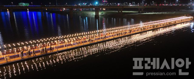 영산강 둔치 체육공원과 축제장을 잇는 임시 부교는 올해 음악·조명 연출을 결합한 감성 공간으로 업그레이드돼 시민들의 포토 명소로 자리 잡았다.