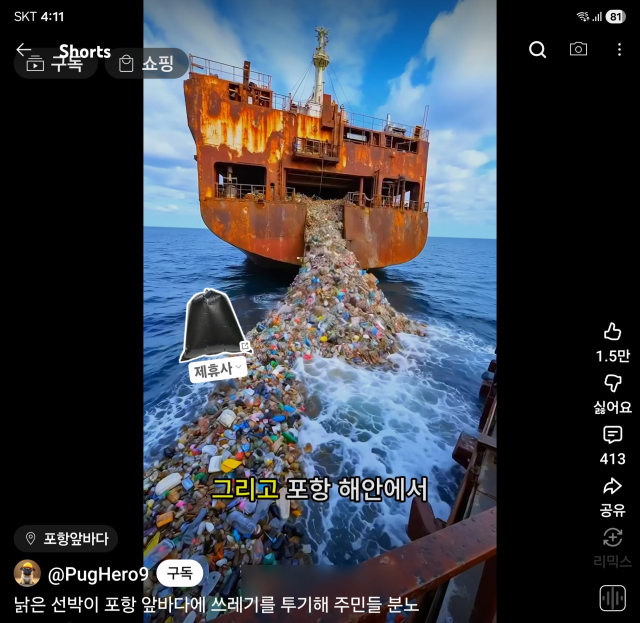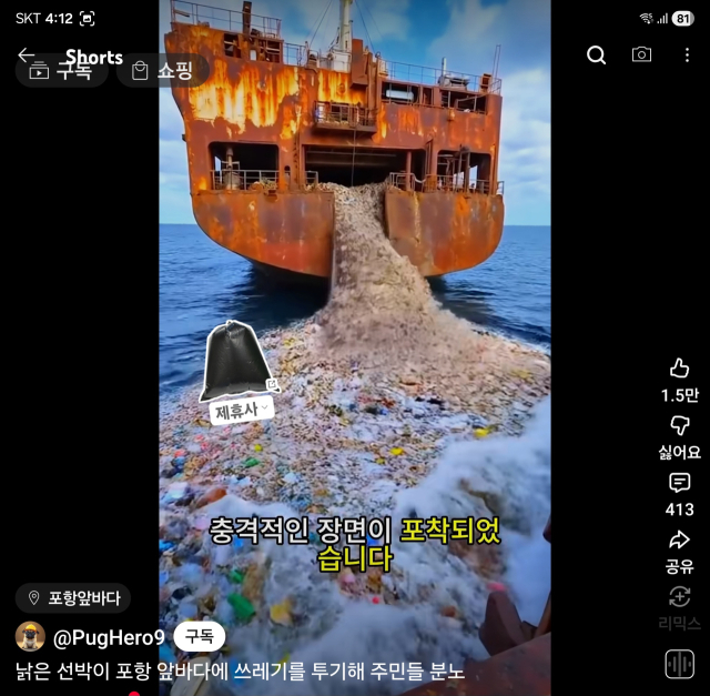 영상은 경북 포항 칠포 앞바다에서 대형 선박이 불법으로 쓰레기를 투기하고 있다는 내용을 담고 있다.