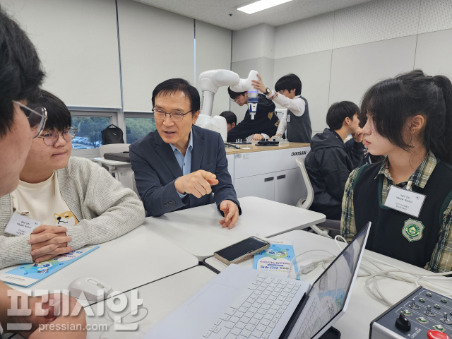 한편, 이날 안산지역 직업계고 학생들이 참여한 가운데 진행된 ‘대학 연계 협동로봇 학생 공동프로그램’ 수업을 참관한 임태희 교육감은 학생들과 직접 협동로봇에 대한 프로그래밍 과정과 실제 운영 과정을 체험하고, 학생들의 진로 계획에 대해 대화를 나눴다.