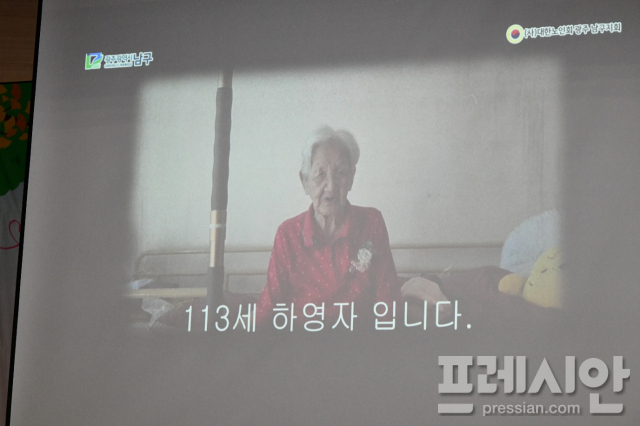 ▲광주 남구에서 113세로 최고령자인 하영자 어르신이 영상을 통해 노인의날 기념식 축하 메세지를 전했다.2025.10.15ⓒ광주 남구