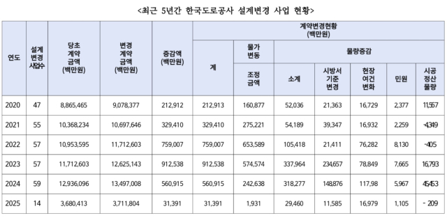 국회 국토교통위원회 김정재 의원(국민의힘, 포항‧북구)이 도로공사로부터 제출받은 자료에 따르면, 2020년부터 2025년까지 총 60건의 고속도로 건설사업에서 설계 변경 등으로 인한 누적 공사비 증가액은 총 2조 8,061억 원에 달했다.