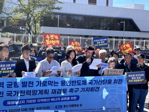 용인 반도체 국가산업단지와 34만 5000V 초고압 송전선 건설의 재검토를 요구하는 전국 각지의 주민대책위와 40여개 환경시민단체는 15일 서울 용산 대통령실 앞에서 기자회견과 퍼포먼스 등을 펼치며 국가균형발전에 역행하는 수도권 중심 전력망 구축 계획과 용인 반도체 국가산단 조성 계획 전면 재검토를 촉구했다.