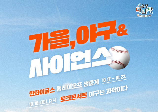 대전 유성구(구청장 정용래)는 7년 만에 가을야구에 진출한 한화이글스의 플레이오프 경기를 주민과 함께 즐기는 공공상영 행사 ‘가을, 야구&사이언스’를 개최한다고 밝혔다.