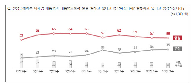 엠브레인퍼블릭·케이스탯리서치·코리아리서치·한국리서치가 지난 13일부터 15일까지 만 18세 이상 남녀 1000명을 대상으로 진행해 16일 발표한 전국지표조사(NBS)에서다. 9월 첫 주(긍정 62%, 부정 28%) 이후 긍정 평가는 하락세를, 부정 평가는 상승세를 지속적으로 보이고 있다.