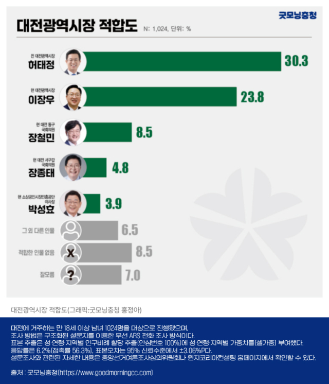 허 전시장은 지난 9월19일부터 30일까지 실시된 TJB-조원씨앤아이 조사에서는 10.8%로 3위를 기록했지만 이는 이후 발표된 굿모닝충청 조사(10월 10~11일) 이전 시점의 결과로 허 전 시장의 지지율 상승세가 본격화되기 직전의 흐름이었다는 분석이 나온다.